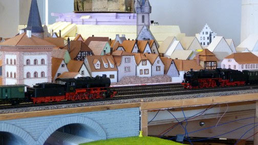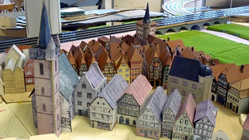 Die Modellanlage ist seit 2012 im Bau. Die am Ende des 2. Weltkriegs zerstörte Altstadt ist modellhaft bereits fertiggestellt, die Züge können bereits programmgesteuert fahren.