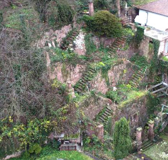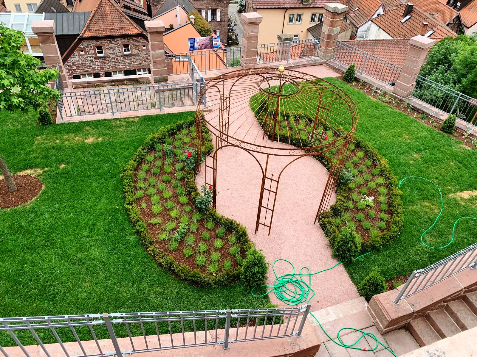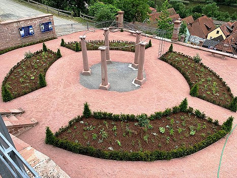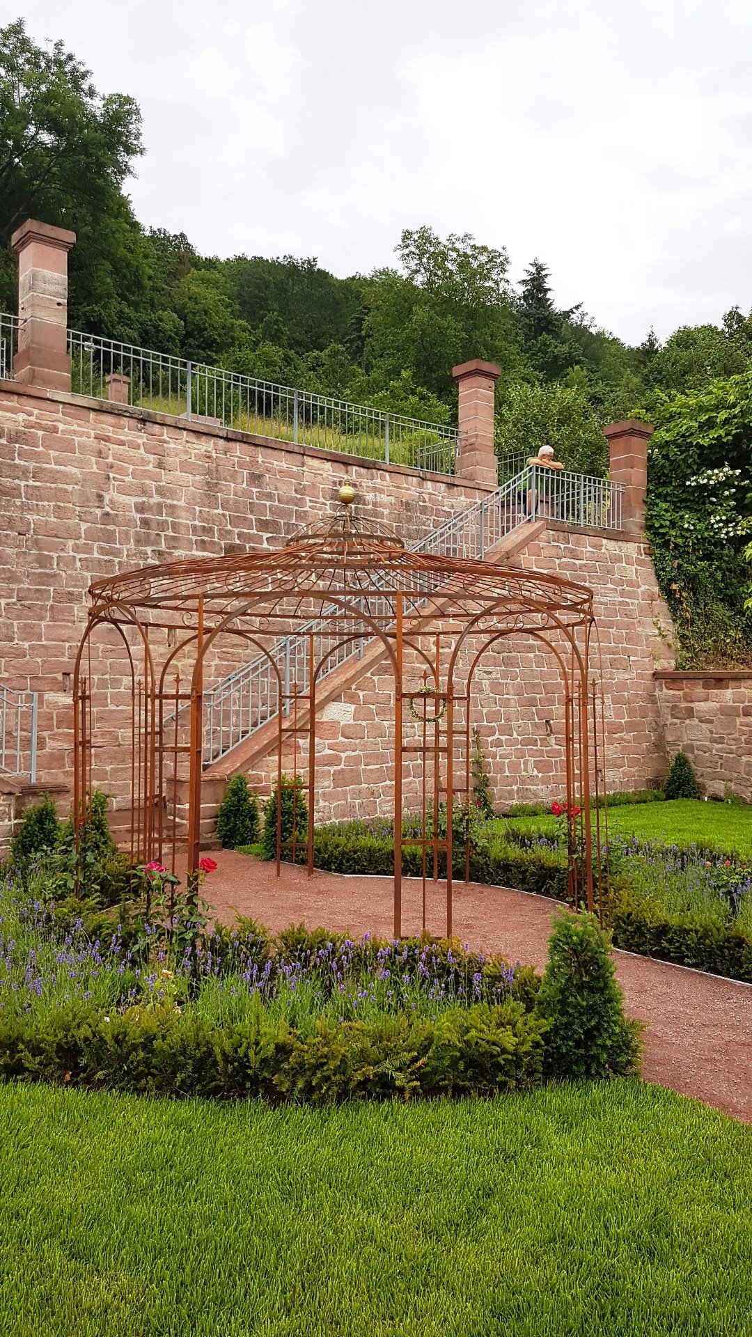 Der Garten gliedert sich in eine Treppenanlage im unteren Teil und drei darüber liegenden Terrassen.