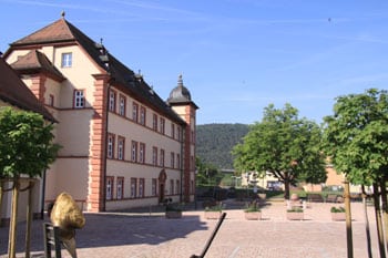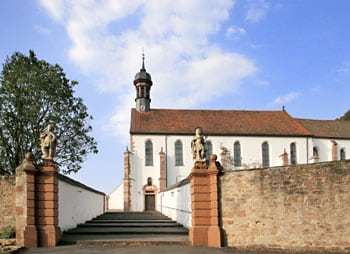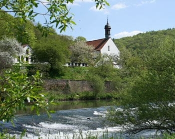 In einem Bogen an der Saale liegt anmutig das Kloster der Franziskanerminoriten Schönau. 1189 hatten Zisterzienserinnen hier ein Frauenkloster gegründet. Nach den Zerstörungen im Bauern- und im Markgräfler-Krieg war es aufgegeben worden. 1699 erwarb der Laienbruder Kilian Stauffer aus Würzburg das inzwischen verfallene Gebäude und begann mit dem Umbau der noch bestehenden Reste der frühgotischen Kirche in barocker Manier und dem Neubau des Klosters. Bald entwickelte es sich zu einem beliebten Wallfahrtsort.