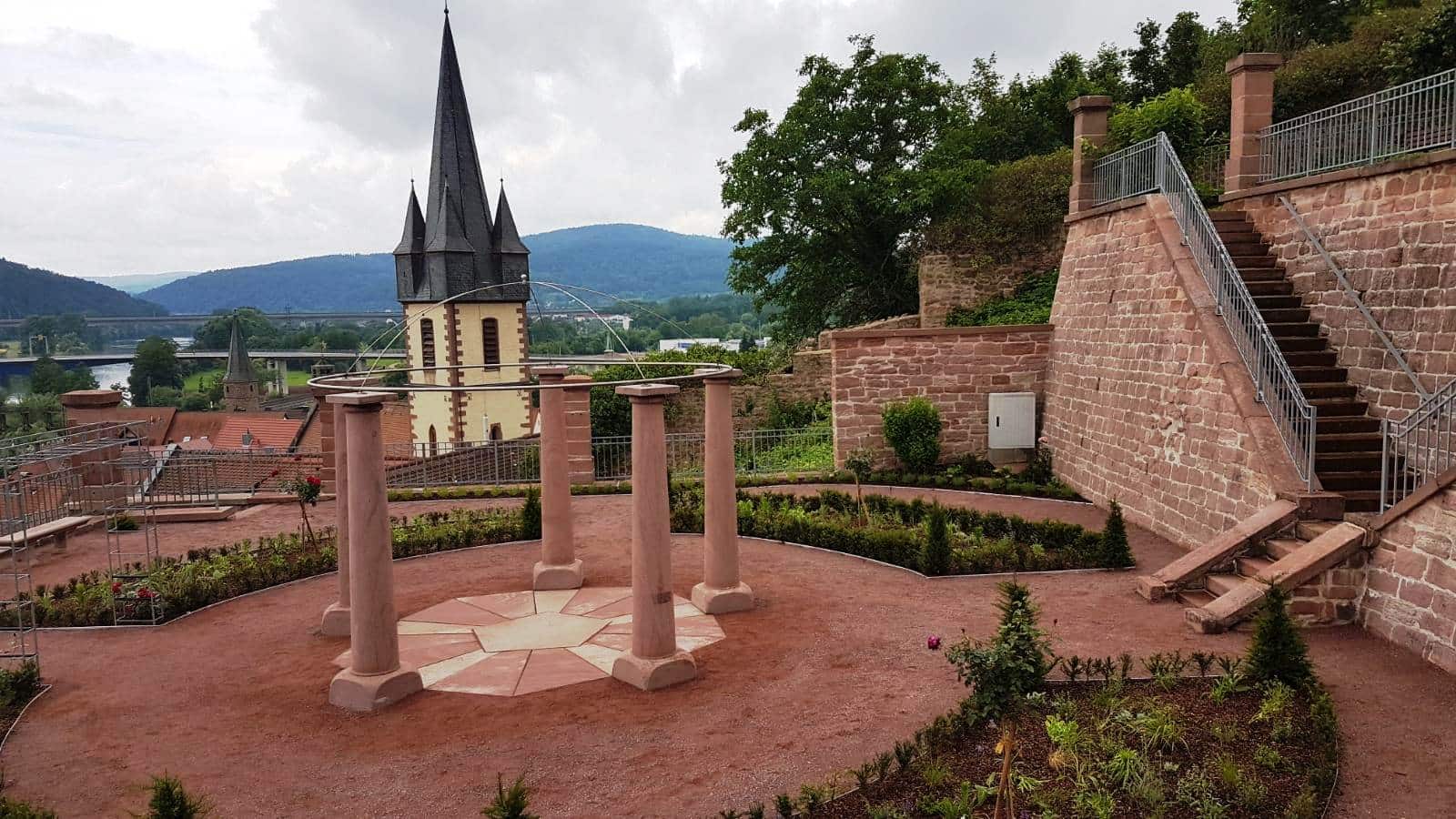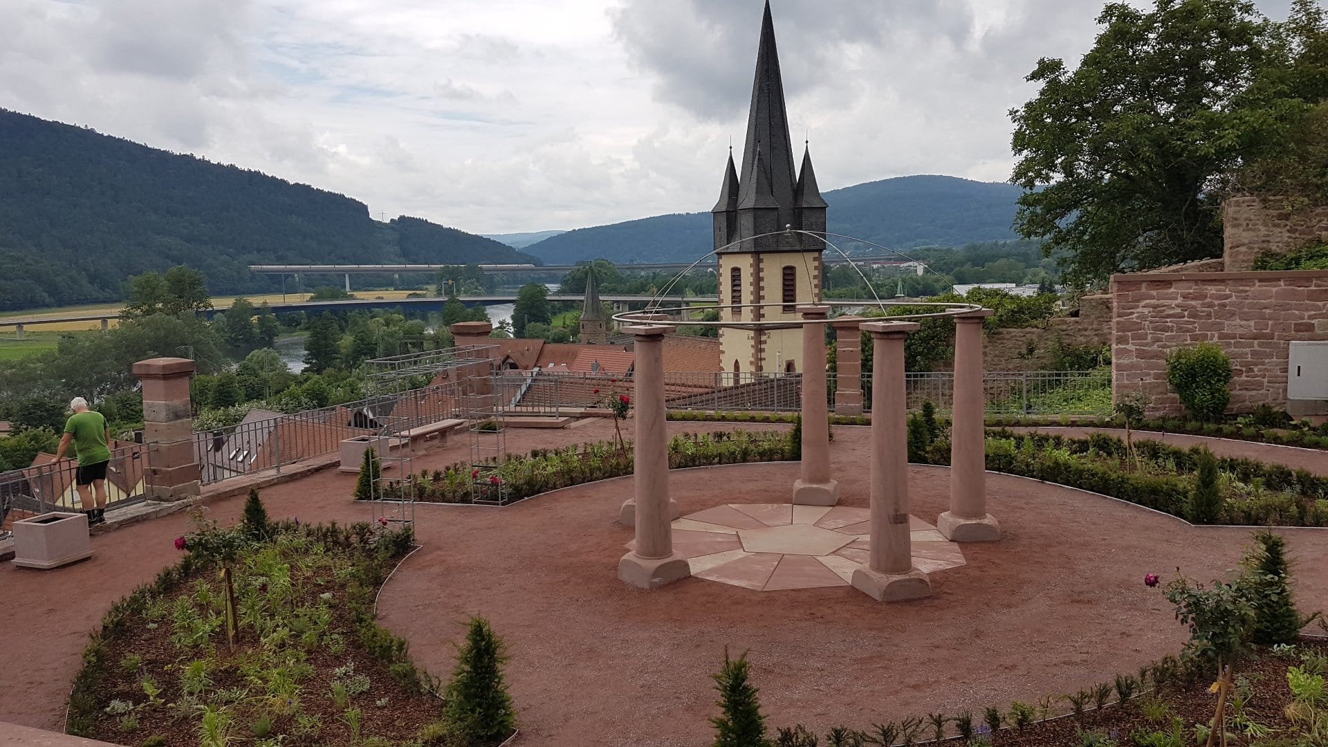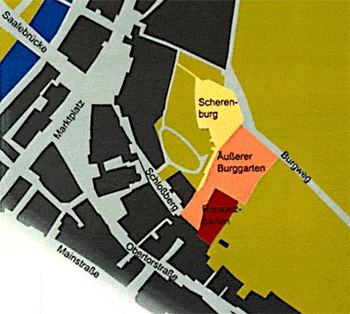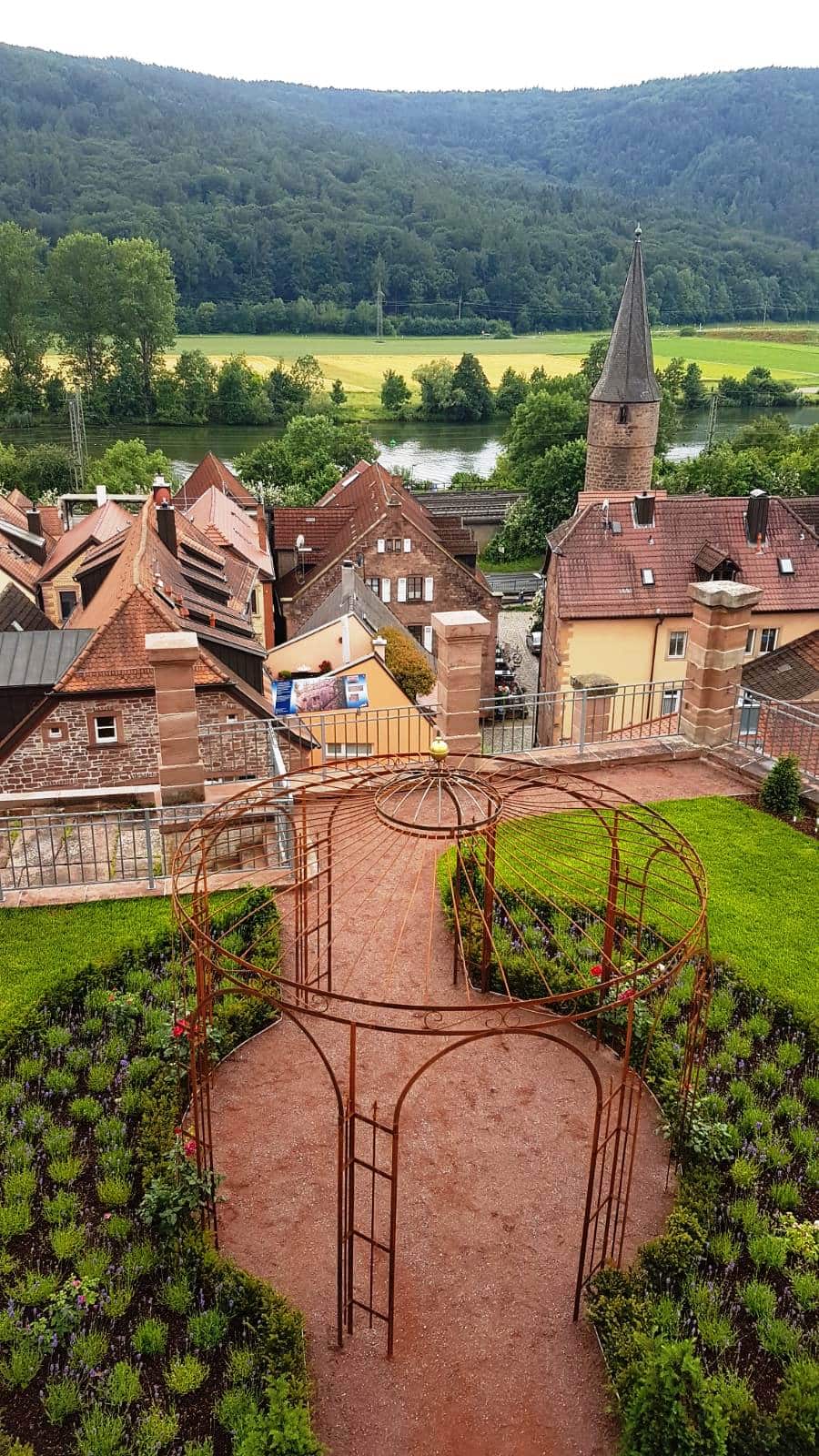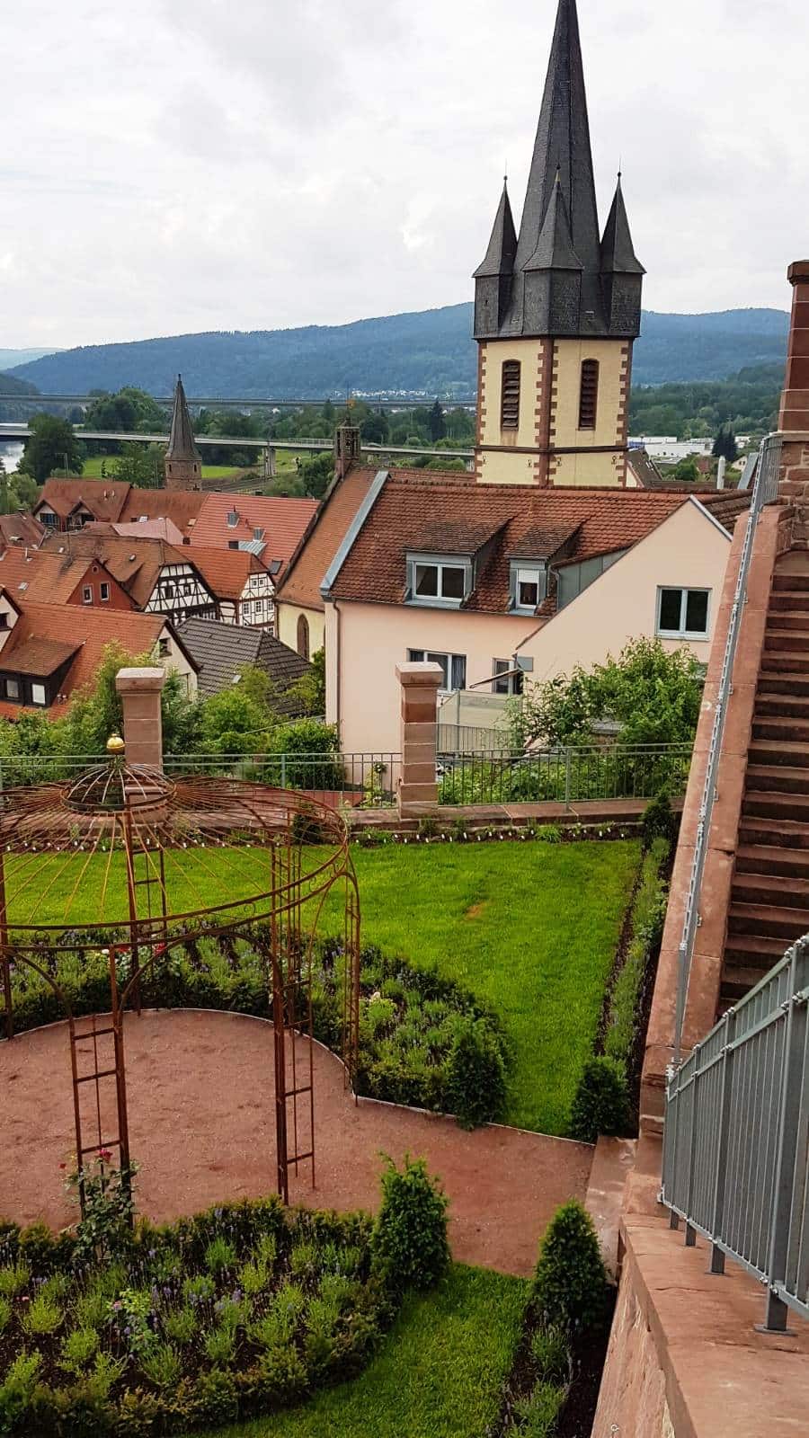 Von den Terrassen aus hat man eine großartige Sicht auf die Altstadt mit der Burg und die drei Flüsse Main, Sinn und Saale.