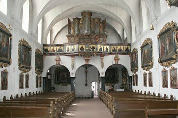 An der Nordwand unter der Empore steht ein dreiteiliger Altar (1710) mit den Holzplastiken Pieta (Gnadenbild), Magdalena und Veronika. Vergoldete Akanthusranken zieren die wuchtige Kanzel mit dem Guten Hirten als Bekrönung. Im Langhaus zeigen 13 große Gemälde verschiedener Meister Szenen aus dem Leben Christi. Die 14 kleinen Kreuzwegstationen wurden 1755 von Urlaub gemalt.