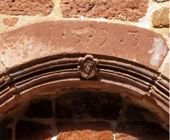 In einem seitlichen vermauerten Tor des Hofareals findet sich oben im Bogenscheitel ein Krebswappen mit den Initialen C. K. und der Jahreszahl 1593. Es stammt nicht aus dem Gartenbereich, hier vermutet man einen Zusammenhang mit dem 1596 fertiggestellten Gemündener Rathaus. Der Bogen könnte in der Nachkriegszeit in diesen Mauerzug als Spolie (wiederverwendeter Stein) eingebaut worden sein. Das Wappen und die Initialien werden der Familie Khues zugeordnet. Der Nachweis einer Verbindung mit dem Fürstbischof Julius Echter, der den Krebs im Wappen führte, gelang nicht.