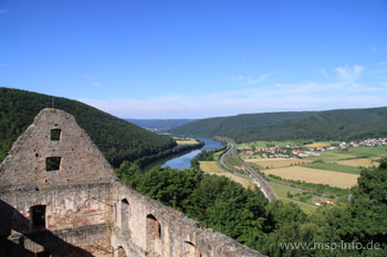 Vom Innern des Burghofes geht der Blick weit hinaus über das Maintal bis zu den ersten Bergen des Spessarts und rechter Hand in das Saaletal hinein.